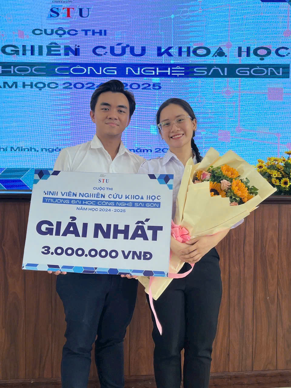 Hai sinh viên trẻ đứng trước bảng của cuộc thi nghiên cứu khoa học Trường Đại học Công nghệ Sài Gòn. Trên tay họ là tấm bảng giải Nhất, cùng bó hoa chúc mừng – những biểu tượng nhỏ bé ghi nhận học thuật. Nhưng trong chiều sâu của khoa học, phần thưởng không phải là con số tiền thưởng hay tấm bảng danh hiệu. Phần thưởng thật sự nằm ở khả năng đặt câu hỏi với thế giới và ý chí đi tìm lời giải.